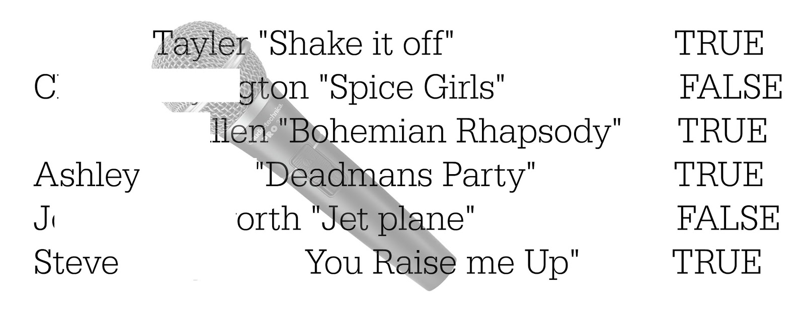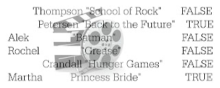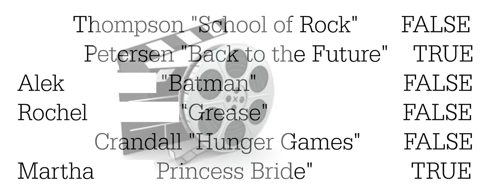 We used peoples favorite movies for this game. They were true or false questions.