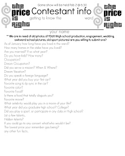 We have had quite a few new people move into our ward. We thought it would be fun to have a "getting-to-know-you" activity. My husband is the EQ pres so we decided to do a combined activity for all the adults in the ward. It was a lot of work but ended up being really successful! Instead of guessing prices of things we had questions about members of the ward.