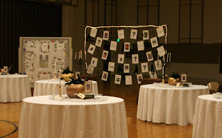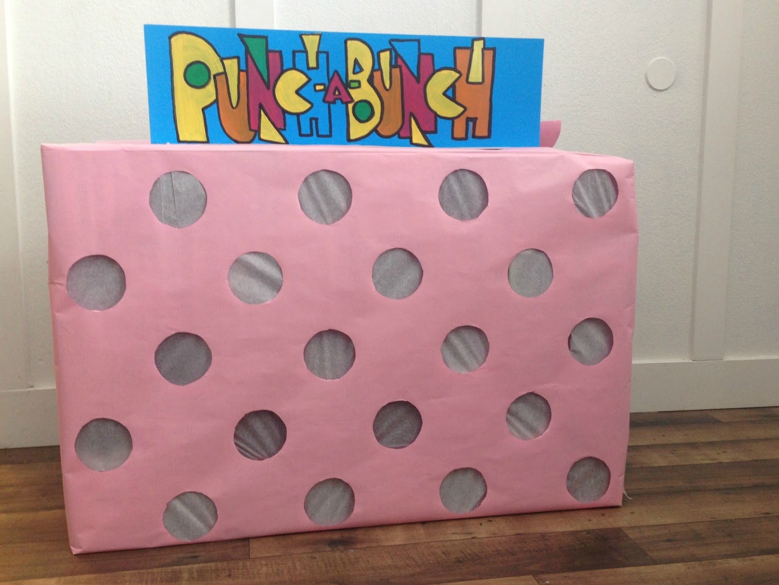 I got 12-pack soda boxes from people in the ward. Every other box I folded in the front and taped a piece of tissue paper around it. I made 5 rows of 8. I taped together each row individually and then at the end taped them all together. I left the back open so I could slip the prize cards inside when I knew what the donations were . Then covered the front with pink butcher paper with holes cut where the tissue paper squares were.