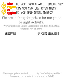 For Prizes I asked for people to donate prizes. It was a fun way for people to show their talents! We received so many fun things. (baked goods, jewelry, quilts, jam, gift cards,etc…) I asked people not to spend a lot of money and that we would prefer something people could take home that night. Not an IOU i.e. 10 hours of babysitting, rolls.