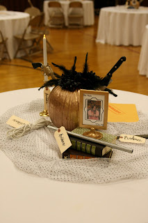 It was November so people still had pumpkins out. I asked a few neighbors for their pumpkins to use as centerpieces. I Spray painted them gold and bought a knife and plastic gun at the dollar store to stick in the pumpkin. I also bought fake flowers and spray painted them black.