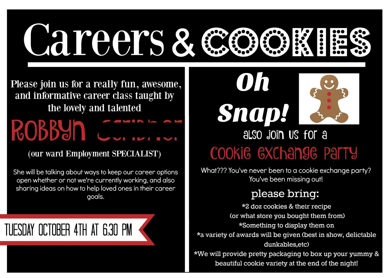 We decided to have simple relief society night activity. We called it Careers & Cookies. WE had our ward employment specialist speak about different career options, Then we had a cookie exchange party. It was a fun relaxing night. And everyone went home with yummy cookies