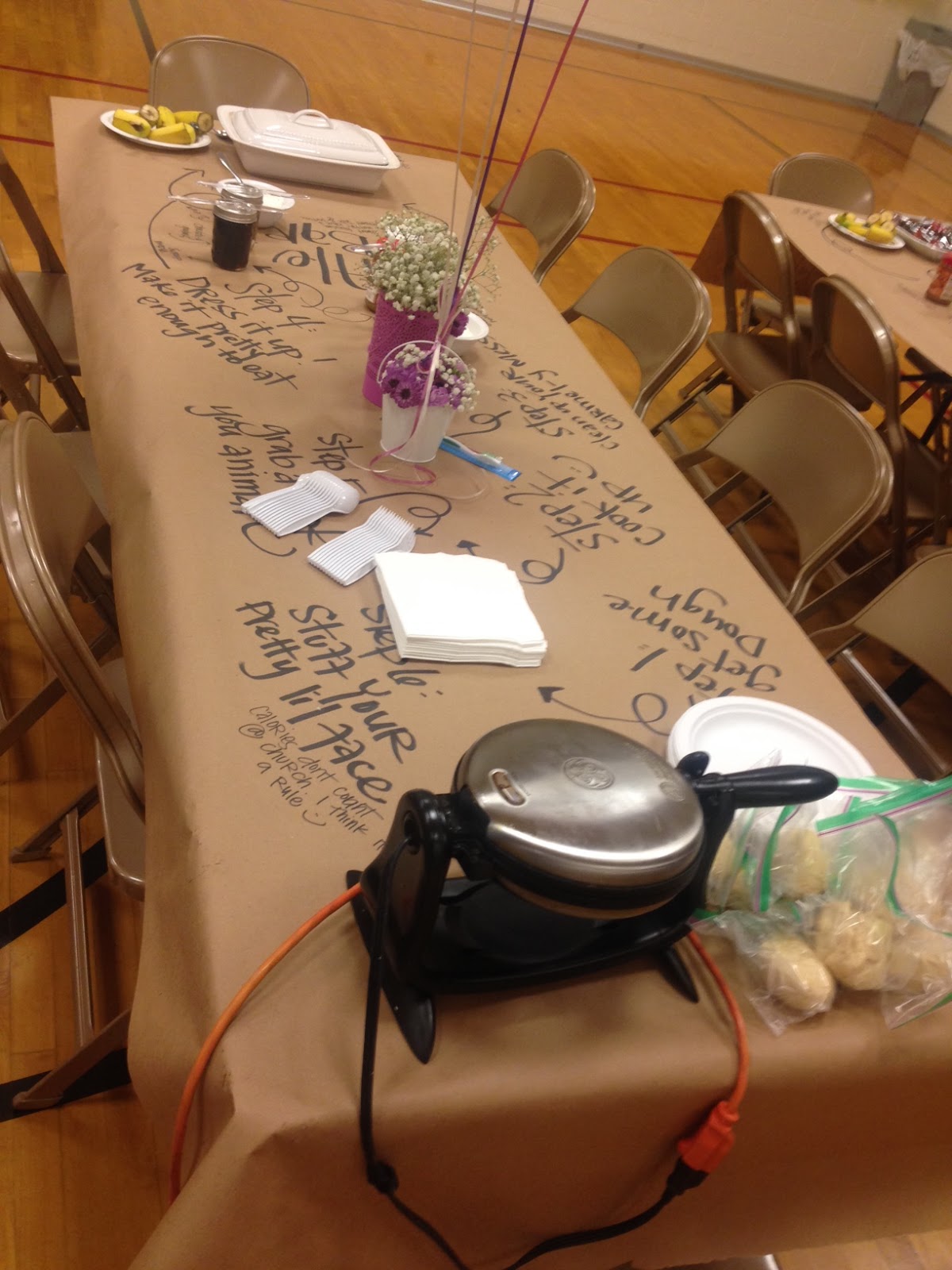 We kept everything very simple! We had butcher paper for table cloths with instructions on how to make the waffles. We had a waffle iron on each table of 8 people. The sisters made their own waffles while visiting with the other sisters on their tables. It turned out great and everyone had a great time. We decided to do Liege waffles because they are super yummy and they aren't as messy to make. We used the recipe we found HERE