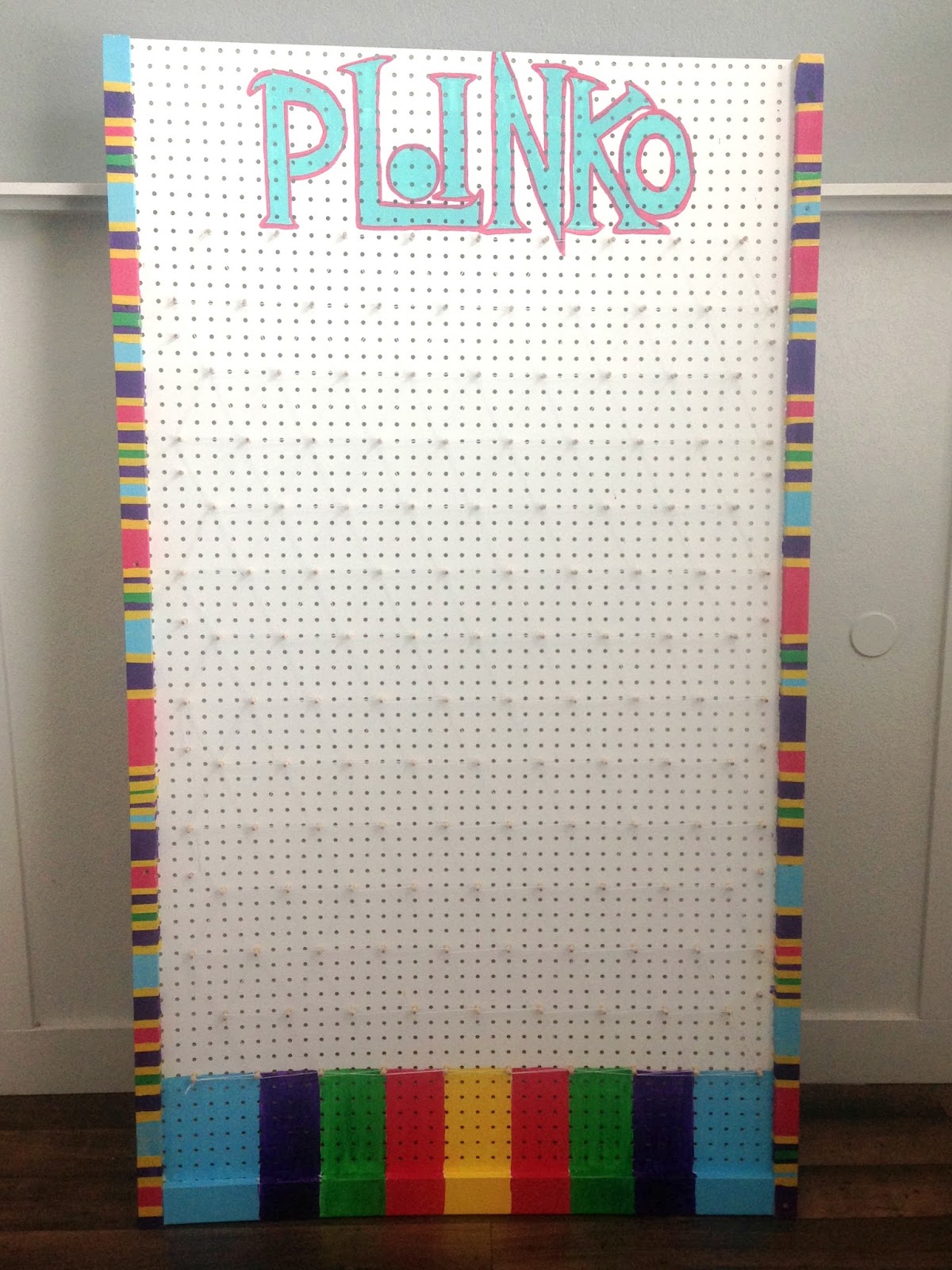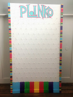 The peg board was 4'x8'. I put pegs every 4th hole across. I used air hockey pucks for the plinko chips. At first my chips were flying off the board, so i tied the ends with string and glue gunned the top to secure the string.